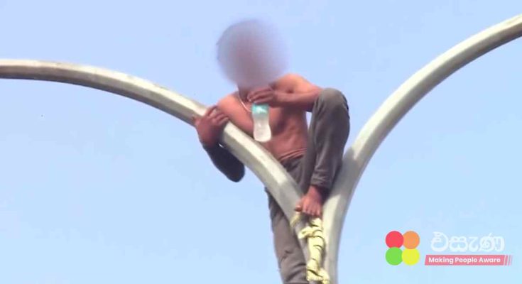 විදෙස්ගත වූ සිය බිරිඳ මෙරටට ගෙන්වා දෙන ලෙස ඉල්ලා ඔහු මෙලෙස විදුලි කණුවක නැගී විරෝධතාවයේ නිරත වී ඇති බවයි සඳහන් වන්නේ.