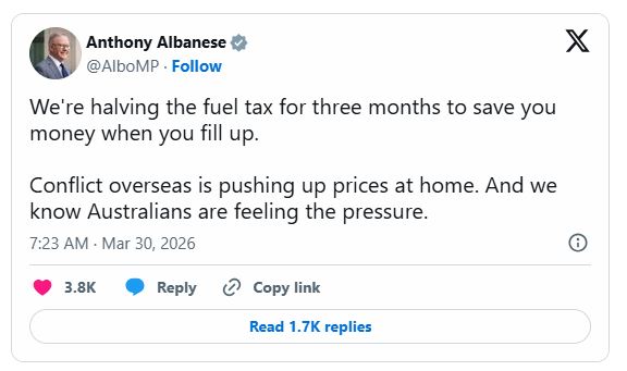 ඕස්ට්රේලියානු අග්රාමාත්ය ඇන්තනී ඇල්බනීස් සිය X ගිණුමේ සටහනක් තබමින් සඳහන් කර ඇත්තේ ජනතාව ඉන්ධන ලබා ගන්නා විට මුදල් ඉතිරි කර ගැනීම සඳහා මාස තුනක කාලයක් සඳහා ඉන්ධන බදු අඩකින් අඩු කිරීමට පියවර ගන්නා බවය.