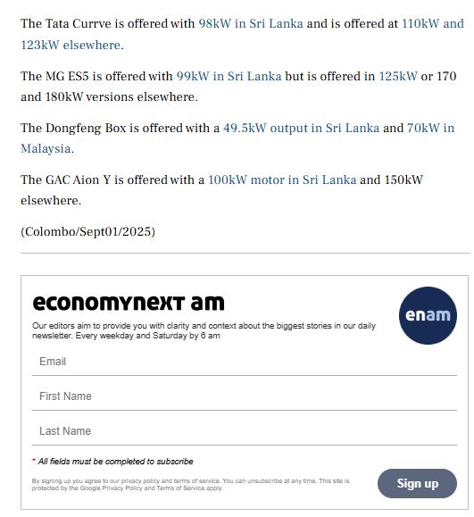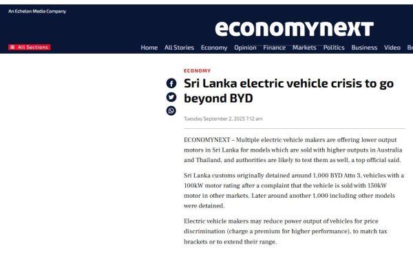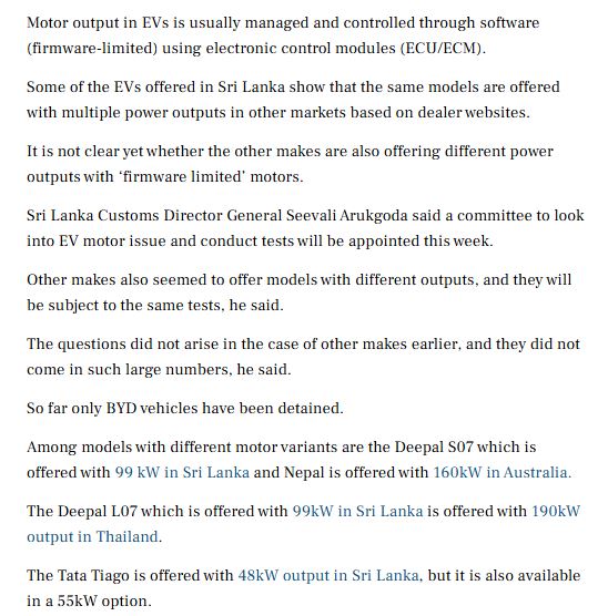 එනමුත් Economy Next වාර්තාවට අනුව මේ වන විටත් මෙරට වෙළඳපොලේ මෝටර් ධාරිතාවේ වෙනස්කම් සහිත EV මාදිලි අලෙවියට යොමු කර තිබෙනවා.