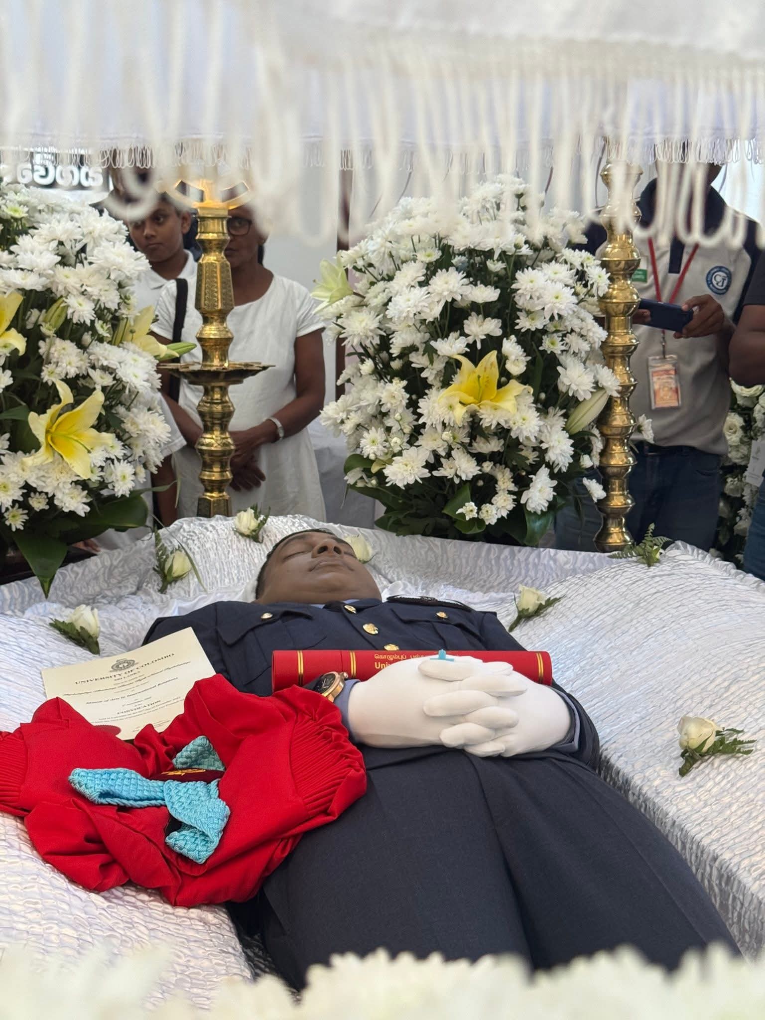 ලුණුවිල හෙලිකොප්ටර් අනතුරෙන් දිවි පිදූ විරුවාගේ පශ්චාත් උපාධි සහතිකය සහ රතු ලෝගුව කොළඹ සරසවියේ උපකුලපති අතින් දේහයට තැන්පත් කර තිබෙනවා.