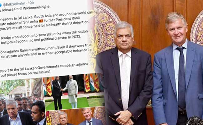 හිටපු ජනාධිපති රනිල් වික්රමසිංහ මහතා අත්අඩංගුවට ගැනීම සම්බන්ධයෙන් අප්රසාදය පළ කරමින් සහ ඔහුව නිදහස් කරන ලෙස ඉල්ලා නෝර්වේ ශ්රී ලංකා හිටපු සාම නියෝජිත එරික් සෝල්හයිම් සිය එක්ස් ගිණුමෙහි සටහනක් තබා තිබේ.