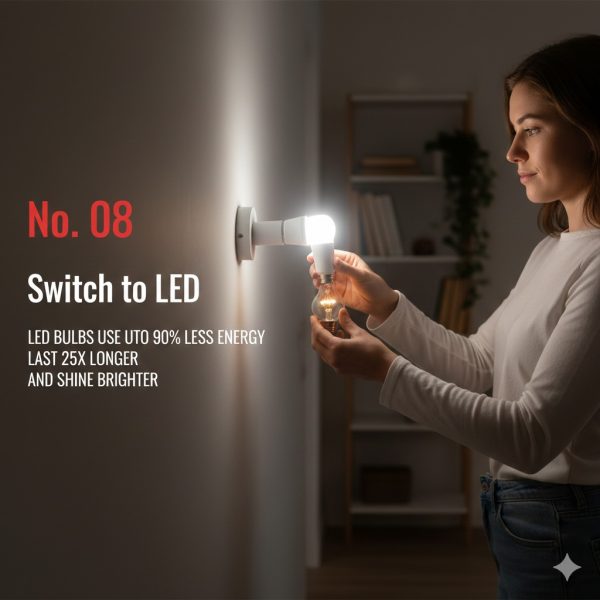 පරණ කහ පාට බල්බ් (Filament) තාම පාවිච්චි කරනවා නම් අදම ගලවලා විසි කරන්න. LED බල්බ් එකක් පරණ බල්බ් එකට වඩා 80%ක් විදුලිය ඉතිරි කරනවා. ඒ නිසා අනිවාර්යයෙන්ම ගෙදරට අලුතෙ බල්බ් ගන්න කොට හොද සන්නාමයකින් LED ඒවාම ගන්න.
