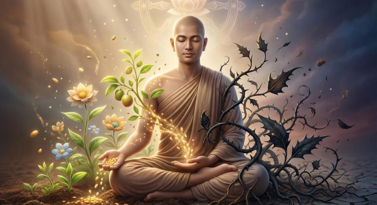කර්මය යනු හේතුඵල දහමකි. අප සිතන සෑම සිතුවිල්ලක්ම, පවසන සෑම වචනයක්ම සහ කරන සෑම ක්රියාවක්ම එක්තරා ආකාරයක බීජයක් වැනිය. මෙම බීජ අපේ ජීවිතය තුළ පුරුදු බවට පත් වේ. එම පුරුදු අපගේ චරිතය නිර්මාණය කරන අතර අවසානයේ අපේ දෛවය තීරණය කරන්නේ ද මේවාය. එය හරියට අඹ ඇටයක් පැළ කළ විට අඹ ගසක් ලැබෙන්නාක් මෙන් සහ කටු පඳුරක් වැවූ විට වේදනාව ගෙන දෙන කටුම ලැබෙන්නාක් වැනි ස්වභාවික ක්රියාවලියකි.