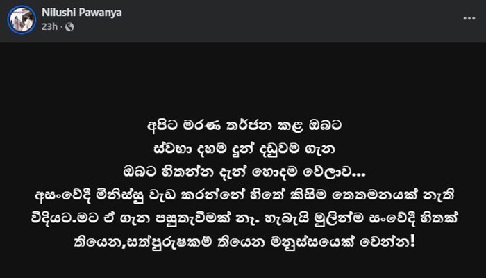 “අපිට මරණ තර්ජන කළ ඔබට ,ස්වභා දහම දුන් දඩුවම ගැන ඔබට හිතන්න දැන් හොදම වේලාව…. අසංවේදී මිනිස්සු වැඩ කරන්නේ හිතේ කිසිම තෙතමනයක් නැති විදියට.මට ඒ ගැන පසුතැවීමක් නෑ. හැබැයි මුලින්ම සංවේදී හිතක් තියෙන,සත්පුරුෂකම් තියෙන මනුස්සයෙක් වෙන්න.”