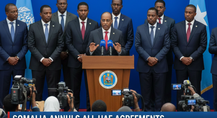 රටේ එකමුතුකම සහ ස්වෛරීභාවයට හානි කරන “හානිකර ක්රියා” උපුටා දක්වමින් සෝමාලියාව එක්සත් අරාබි එමීර් රාජ්යය සමඟ ඇති සියලුම ගිවිසුම් කපා හැර ඇති අතර, ප්රධාන වරාය මෙහෙයුම්, ආරක්ෂක සහයෝගීතාව සහ ආරක්ෂාව දක්වා විහිදෙන ගනුදෙනු අවලංගු කර ඇත.